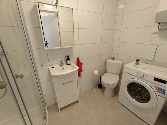 Łazienka z WC: szafka, lustro, kabina prysznicowa, pralka.