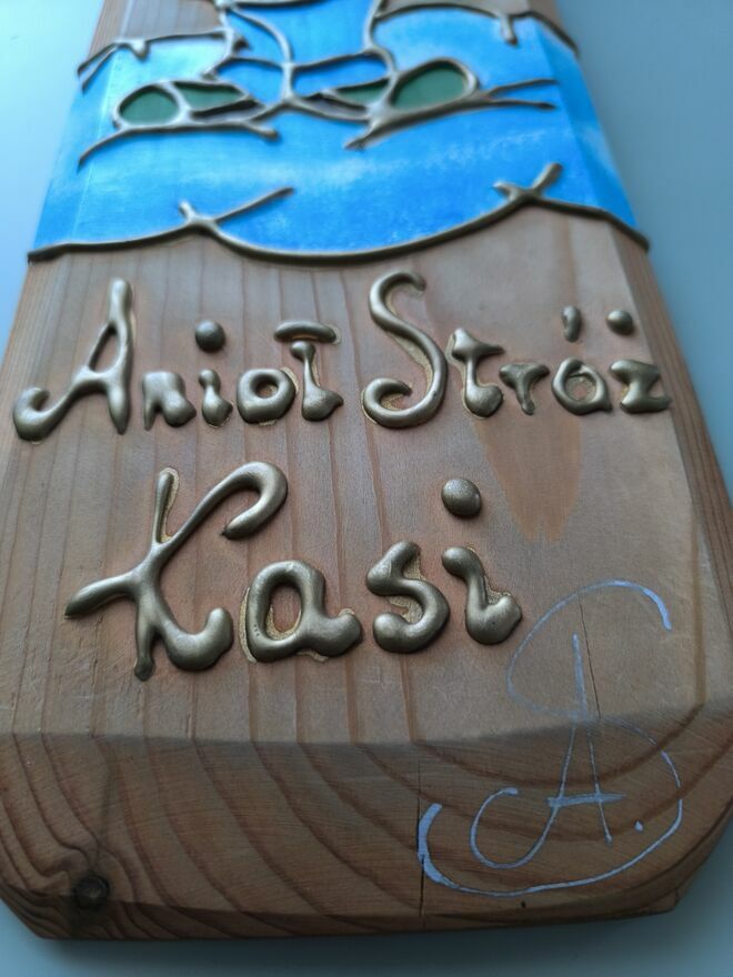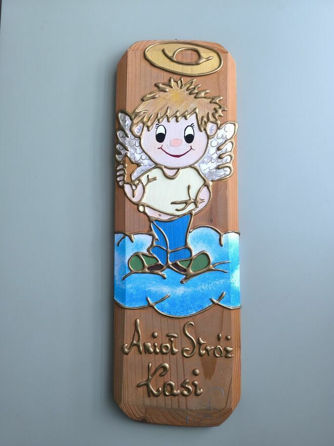 Sprzedam wyrób rzemiosła artystycznego - dedykowany (Aniołek Stróż Kasi),na desce sosnowej o grubości 2,5 cm.