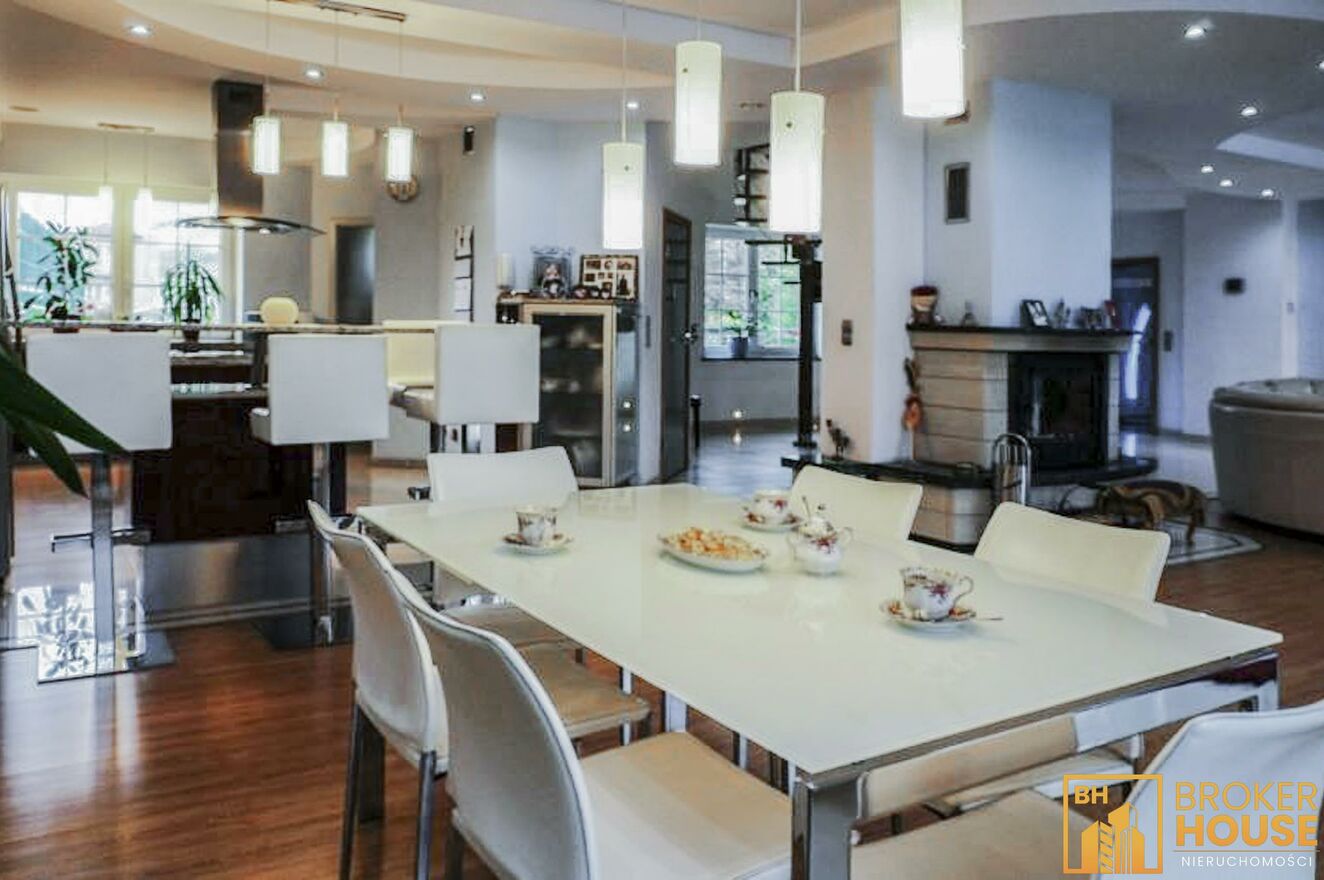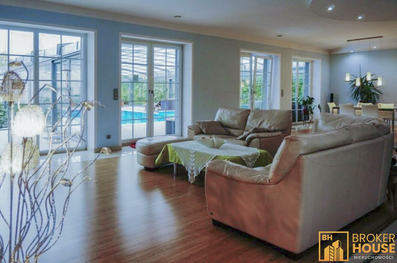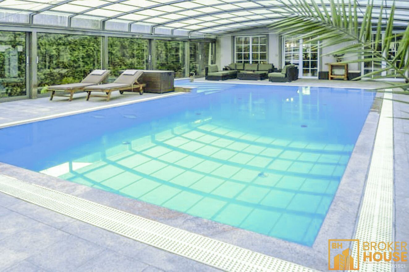 Nieruchomość z przeszklonym basenem w połączeniu z salonem o powierzchni 270m2 oraz dodatkowo na działce znajduje się budynek z mokrą i suchą sauną, garażami, gabinetem i mieszkaniem o łącznej powierzchni 160m2. Basen podświetlany z rozsuwanym dachem i bocznymi ścianami, mogący pełnić swoją funkcję zarówno w lecie jak i w zimie, ponadto bieżnia, jacuzzi, system pochłaniania pary wodnej. Budynek usytuowany na pięknie zagospodarowanej 26arowej działce, z m.in. oczkiem wodnym, wysepką, na której znajduje się rekreacyjna altanka z drewnianych bali, dachem pokrytym strzechą trzcinową, grillem, wędzarnią. Ponadto w ogrodzie wiele ozdobnych roślin, skalników, dekoracyjnych kamieni. Garaż dwustanowiskowy w wolnostojącym budynku, nad którym znajduje się 2-pokojowe mieszkanie z balkonem, kuchnią i łazienką. Posesja wyłożona kostką granitową, ogrodzona ze stali nierdzewnej, brama wjazdowa z automatycznym sterowaniem. System zabezpieczenia alarm z powiadomieniem.