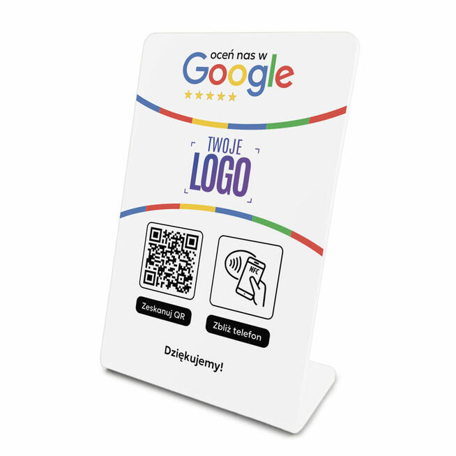 Stojak, prezenter gięty z kodem QR, tagiem NFC i logo Twojej firmy do zbierania opinii w Google jest idealnym rozwiązaniem ...