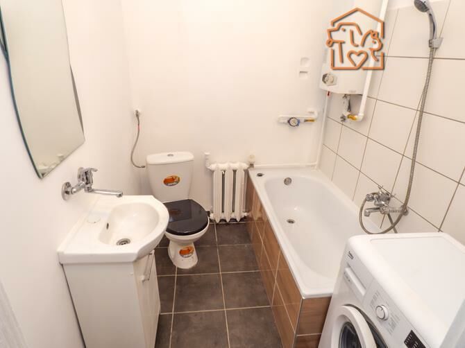 Łazienka: wanna, umywalka, pralka.